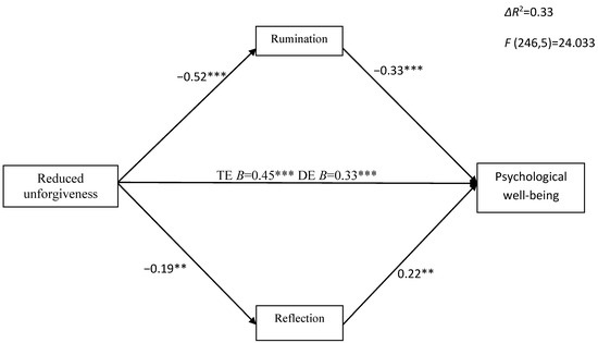 The indirect effect of reduced unforgiveness on psychological well-being via rumination and reflection. TE—total effect; DE—direct effect; ** p < 0.01; *** p < 0.001.