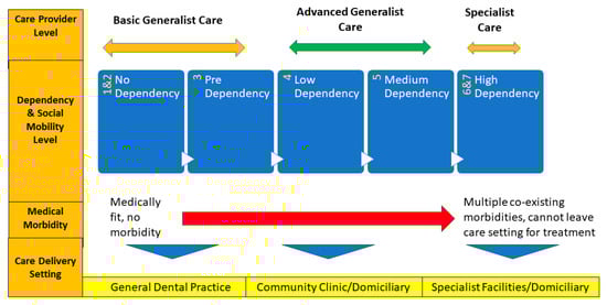 | High dependency, CSHA levels 6 and 7 | People who have complex medical problems preventing them from moving to receive dental care at a dental clinic. They differ from patients categorised as medium dependency because they cannot be moved and must be seen at home |