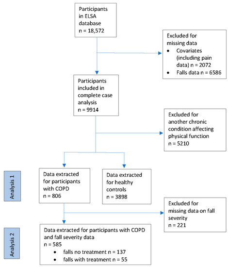 A total of n = 18,572 people aged 58 and over were included in the initial database. After the removal of cases with missing data, n = 9914 were available for a complete case analysis; n = 2072 had missing data on included covariates (age, sex, wealth, and/or education), and n = 6586 were missing fall variable data. Once the data for groups were extracted from the complete case data, there were n = 806 people with COPD and n = 3898 healthy controls (Figure 2). Once these missing data on the severity of falls were excluded, the second analysis featured n = 585 people with COPD.