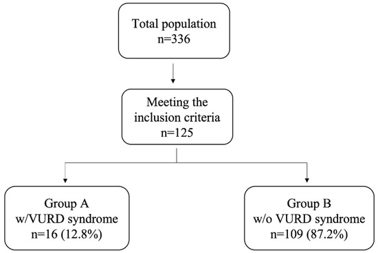Flow chart of patients meeting the inclusion criteria and showing VURD syndrome present in almost 13% of our population.