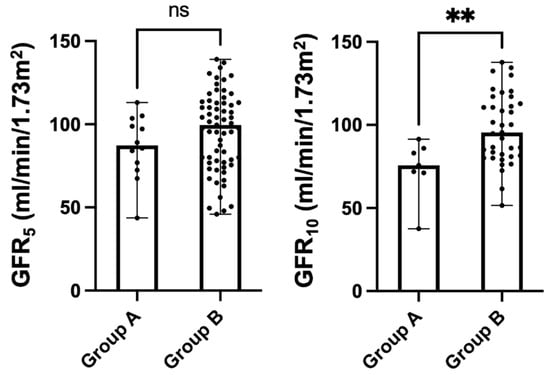 Kidney function as measured via iohexol clearance at 5 (GFR5) and 10 (GFR10) years of age in children with (Group A, n = 16, 12.8%) and without (Group B, n = 109, 87.2%) VURD syndrome. The entire cohort of patients with PUV included in the study was considered in the analysis. Scatter dot plots were represented as median with ranges. Abbr. ns: not statistically significant; ** p-value < 0.001.