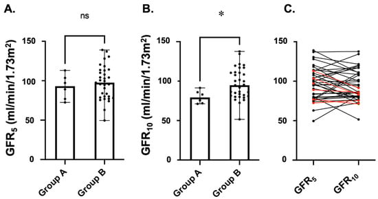 Kidney function as measured via iohexol clearance in children with (Group A, n = 6, 15.4%) and without (Group B, n = 33, 84.6%) VURD syndrome. Only children with PUV who underwent this measurement at both 5 (GFR5—A) and 10 (GFR10—B) years of age were considered in this longitudinal analysis. Scatter dot plots were represented as medians with ranges. In (C), we show the longitudinal change in GFR value for each patient. Red lines represent children of Group A and black lines children of Group B. Abbr. ns: not statistically significant; * p-value < 0.05.