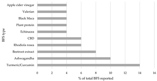 The most frequently reported types of FS are presented in Figure 1, suggesting that “Protein”, “Vitamin D”, and “Vitamin C” were most popular among both elite and amateur athletes. Overall, current BFS use was reported by 16% of the cohort (n = 32 amateur, n = 2 elite), with elite athletes not disclosing any further detail on BFS names, frequency of use, dosage, or reason for use. Figure 2 presents the most popular types of BFS reported by amateur athletes among a wide variety of products reported, and suggests “Turmeric/Curcumin”, “Ashwagandha”, and “Beetroot extract” were the most frequently reported. Other BFSs which were highly ranked by respondents included, “Chamomile”, “Beetroot extract”, and “Cannabidiol/CBD”.