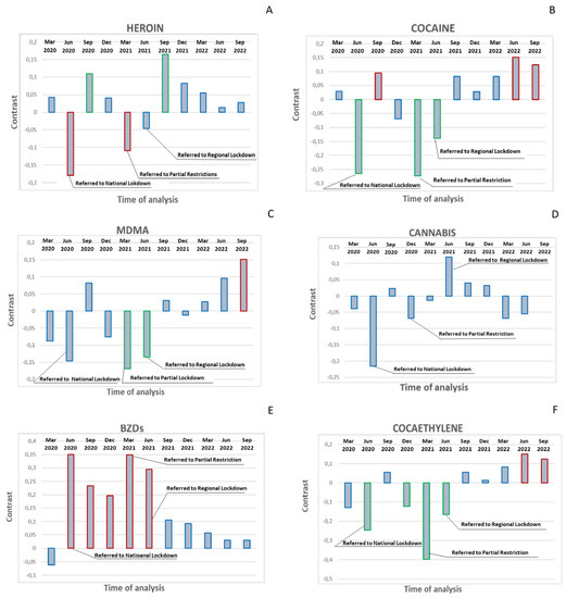 Contrast post-estimation after GEE model for heroin (A), cocaine (B), MDMA (C), cannabis (D), BZDs (E), and cocaethylene (F) at all monitoring times vs. baseline values in December 2019. Red outline = significantly higher than December 2019; green = significantly lower than December 2019; blue = not significantly different from December 2019.
