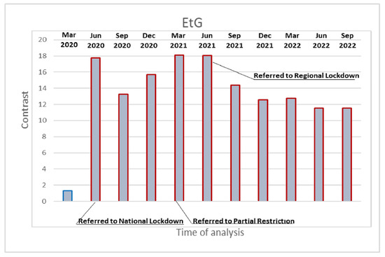 Alcohol intake showed a similar pattern to that for BZDs, which was monitored in the present study by measuring variations of EtG in hair, a helpful biomarker used to measure alcohol consumption during previous months [25]. Abstinence from alcohol could be demonstrated using internationally adopted cut-off concentrations (EtG in hair < 5 pg/mg), whereas chronic excessive drinking with a daily ethanol consumption of 60 g or more could also be determined (EtG in hair > 30 pg/mg) [23,26]. Statistical analysis of alcohol data was based on the amount of EtG measured in the hair of the participants over 12 three-month intervals. The EtG values detected throughout 2 years of monitoring were significantly higher compared to pre-lockdown levels (EtG median: 41.65 ± 13.96 and 43.13 ± 15.00), with the highest values being recorded after the 2020 lockdowns (EtG median: 59.50 ± 16.07; contrast 17,768, p < 0.001) and 2021 (EtG median: 57.41 ± 17.58; contrast 18.05, p < 0.001). Notably, even in the final monitoring periods, when the restrictive measures had definitively ended in Italy, they remained significantly higher than the baselines in September 2022 (EtG median value 51.58 ± 24.36; contrast 11.548 p < 0.001) (Figure 2, Table S1). Furthermore, 80% of the subjects had an EtG value > 30 pg/mg before lockdown, with 100% and 96% during the 2020 and 2021 lockdowns, respectively, with 75% at the last control. According to the measurement of cocaethylene (Figure 1F and Table S1), the metabolite produced when cocaine and ethanol are consumed together, almost all subjects who used cocaine also drank alcohol at the same time (85% before lockdown, 100% and 94% during the 2020 and 2021 lockdowns, respectively, and 100% at the final control).