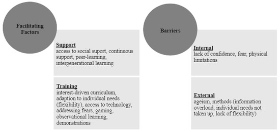 In the following, recommendations from the included publications are compiled, which support or hinder the learning of older people in dealing with digital devices as well as the use of educational offers. Figure 2 shows a comparison of facilitating factors as well as barriers. The “Model for Promotion of ICT for Older Adults” by Barrie et al. (2021) was used as a guide. Among the promoting factors, social support in particular can be highlighted as an essential success factor of educational programs [13]. Furthermore, the recommendations refer to framework conditions and training methods. Therefore, the facilitating factors were divided into the categories of support and training. Barriers are divided into those that arise from within the individual (internal) and those that arise from the external (social context) or from the training offered.