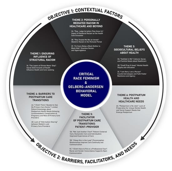 Chicago/Turabian StyleOgunwole, S. Michelle, Habibat A. Oguntade, Kelly M. Bower, Lisa A. Cooper, and Wendy L. Bennett. 2023. "Health Experiences of African American Mothers, Wellness in the Postpartum Period and Beyond (HEAL): A Qualitative Study Applying a Critical Race Feminist Theoretical Framework" International Journal of Environmental Research and Public Health 20, no. 13: 6283. https://doi.org/10.3390/ijerph20136283