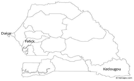 We are interested in three regions of Senegal: Dakar (hypoendemic zone), Fatick (endemic zone), and Kedougou (hyperendemic zone) located in the map presented in Figure 1.
