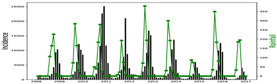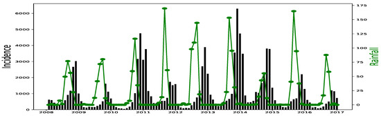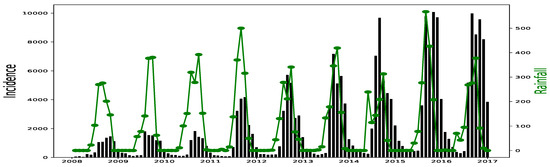 Malaria (falciparum malaria incidence count per month, black) and rainfall (mm per month, green) in Dakar, 2008–2016.