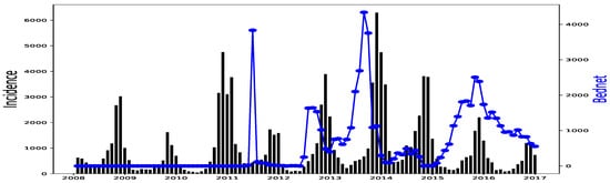 Malaria (falciparum malaria incidence count per month, black) and Bed-net distributed (the number of insecticide treated bed-nets distributed per month, blue) in Dakar, 2008–2016.