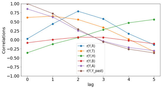 The plots of the malaria cases and the explanatory variables (e.g., Figure 2, Figure 3 and Figure 4) reveal that there is a delay between the maximum of malaria cases and the maximum of the explanatory variable) in the three data sets. This delay is called lag and represented by ℓ in the formulae. We set