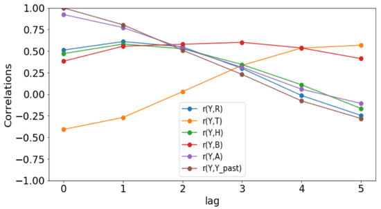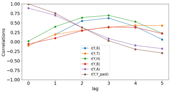 where r denotes the sample Pearson correlation coefficient. The statistical results are presented in Table 1 (reproduce with Determination_of_lag_2022_07_23.py) and the evolution of correlations as function of lags is illustrated in Figure 8, Figure 9 and Figure 10 (reproduce with Correlation_Plots_2022_07_23.py).