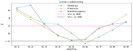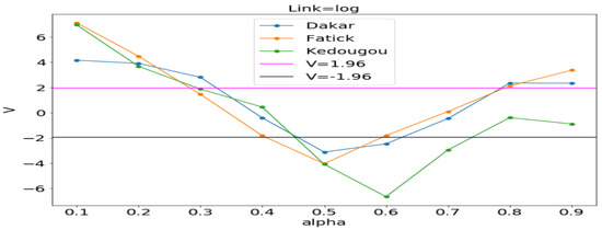 Figure 11, Figure 12 and Figure 13 (reproduce with Vuong_test_2022_07_23.py) present the dependence of the Vuong test value (V) with respect to (dispersion parameter). The figures show that the computed by OLS is usually in the window where the Poisson model is preferable to the NB model. An exception is observed in Kedougou where none is preferred with log and sqrt. We can conclude that the use of the GLM with Poisson distribution is justified.