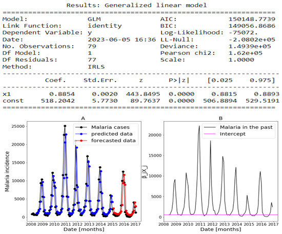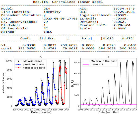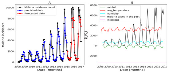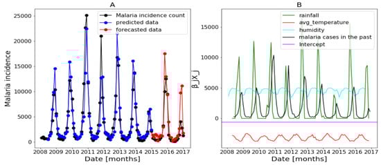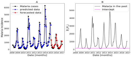Forecasting results in Dakar, no saturation applied. Malaria incidence means the falciparum malaria incidence count per month. We present the forecast results (noted by A) and the curves of (noted by B).