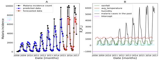Forecasting results in Fatick: no saturation applied. Malaria incidence means the falciparum malaria incidence count per month. We present the forecast results (noted by A) and the curves of (noted by B).