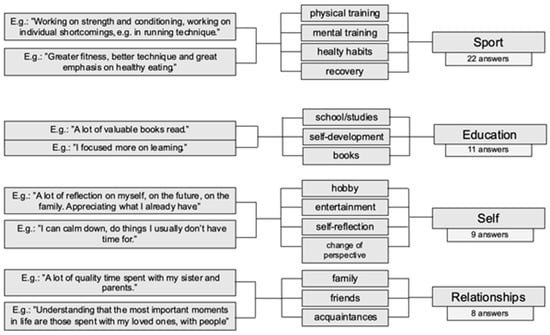 Secondary gains observed by the football players (Figure 1) were associated with a range of variables. However, an analysis of the data captured some extremely important processes in the participants’ responses. Two elements repeatedly pointed out among the benefits of the COVID-19 pandemic were self-reflection and an opportunity to step back from daily functioning in sports. The period of isolation was a time during which the players could think of and redefine their priorities. Reflection on their lives enabled them to see and appreciate the resources they had, especially their relationships with other people. Looking at their lives from a different perspective also led them to another observation—the need to develop not only in football but also in other areas not connected with the sport.