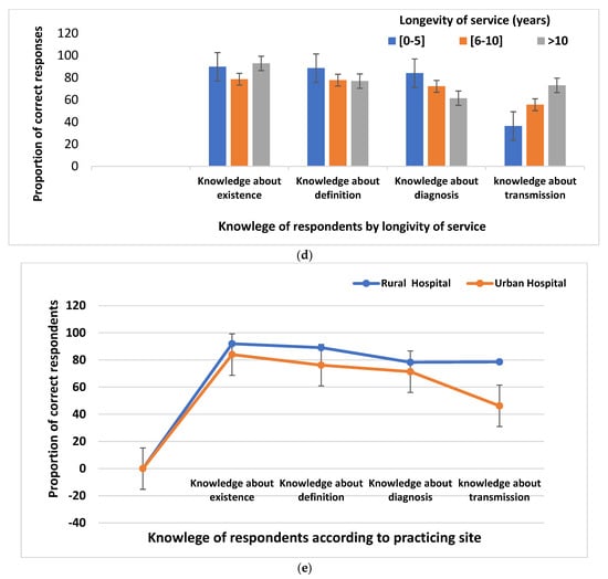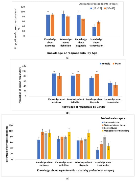 (a) Participants’ knowledge about asymptomatic malaria by age; (b) participants’ knowledge about asymptomatic malaria by gender; (c) participants’ knowledge about asymptomatic malaria by professional category; (d) participants’ knowledge about asymptomatic malaria by longevity of service; (e) participants’ knowledge about asymptomatic malaria according to practicing site.