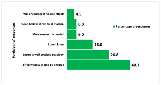 Figure 3 shows that the main opinions and concerns of respondents about the use of Artemisia afra tea included a need to ensure the effectiveness of the tea (27/67; 40.3%), a precise posology (26.8), and the absence of side effects (4.5%).