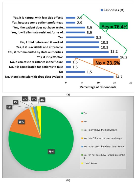 Notwithstanding the aforementioned aspects of acceptability, more than three-quarters (79%) of respondents were ready to prescribe/use Artemisia afra teas if endorsed by the state authorities, and 19% said they would not continue to prescribe it after endorsement unless they received knowledge of its prescription, while 2% were still undecided (Figure 4b).