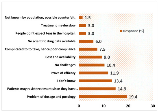 Figure 5 shows the challenges of using Artemisia afra tea infusions to treat asymptomatic Plasmodium carriers predicted by HCWs. These included the problem of dosage and posology (19.4%), the likelihood that patients may resist treatment since they have no symptoms (14.9%), proof of efficacy (11.9%), cost and availability (9%), poor compliance because teas are complicated to take (7.5%), no scientific drug data available (6%), the fact that people do not expect teas in the hospital (3%), and possible counterfeit, since the tea is not well known by the population (1.5%).