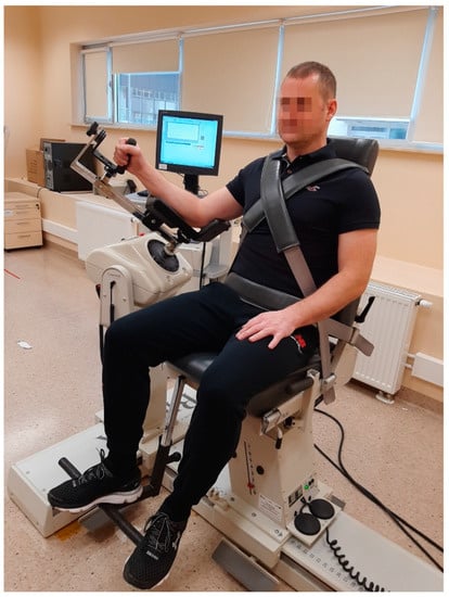 The examination of the external rotators of the shoulder joint was performed under eccentric working conditions. Five repetitions were made at an angular velocity of 90°/s. During the assessment, the subjects were encouraged to develop their maximum speed and strength, which guaranteed the objectivity of the assessment. The test was started from the position of maximum external rotation in a predetermined range of motion. Before starting the study, the subjects performed a standardized warm-up consisting of exercises on a rotor for upper limbs (5 min), active exercises with a gymnastic stick (5 min), and exercises on the test stand, where a trial series consisting of 10 repetitions of an eccentric external rotation at a speed of 180°/s was performed with any patient involvement in the task [22].