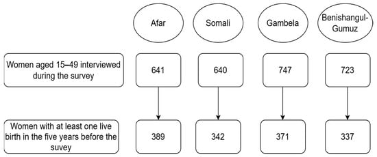Women aged 15–49 who had a live birth in the five years before the survey, and are residents of the emerging regions of Ethiopia (Afar, Somali, Gambela, or Benishangul-Gumuz), were included. Figure 1 shows the sample size and the number of women included in the survey.