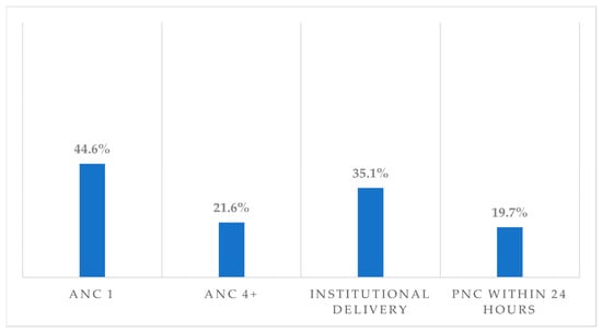 Nearly half (44.6%, 95% CI, 38.7–51.0%) of the study participants had at least one ANC visit, however, fewer than a quarter (21.6%, 95% CI, 17.6–26.0) of them had four or more ANC visits during their recent pregnancy. Over one-third (35.1%, 95% CI, 27.7–43.0) gave birth in health institutions, and less than one-fifth (19.7%, 95% CI, 16.1–24.0) of women received a Postnatal Care (PNC) within 24 h after delivery (Figure 2).