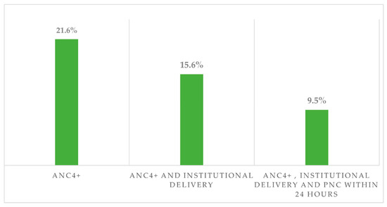 Out of the 21.6% (95% CI, 17.6–26.0) women who had four or more ANC visits, 15.6% (95% CI, 12.2–20.0) gave birth in health institutions, and 9.5% (95% CI: 7.0–13.0) of them received postnatal care within 24 h after the institutional delivery (Figure 3).