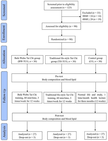 Even though Tai Chi has many benefits, research on the health benefits of different styles of Tai Chi for the overweight population, such as Bafa Wubu Tai Chi (BW-TC) and traditional He style Tai Chi (TH-TC) exercises, remains limited, and support for the health benefits of traditional Tai Chi exercise remains weak. Because overweight university students often have difficulty finding effective, enjoyable exercise plans to improve their physical health, comparing the effects of these two types of Tai Chi is particularly meaningful, as they may be feasible choices for this population, even though further research is needed to understand the effects thereof on health risk factors such as blood lipids and body composition. BW-TC exercise is a simplified Tai Chi routine promoted by the General Administration of Sport in China, with simple and easy-to-learn movements consisting of 16 forms, each of which takes approximately three minutes [26]; in contrast, TH-TC exercise is a traditional form of Tai Chi with complex movements consisting of 72 forms, each of which takes approximately 5–8 min to complete [28]. Notably, there is currently no research exploring the effects of BW-TC and TH-TC exercises on overweight and obese individuals.