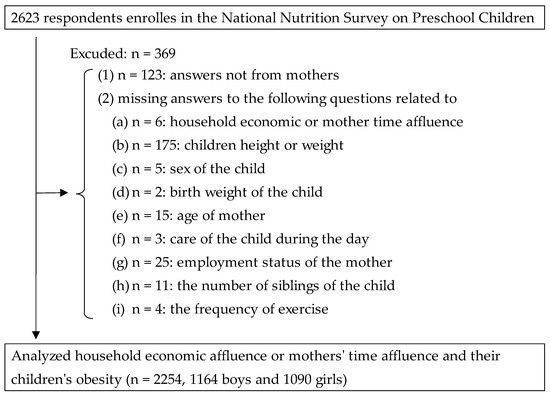 Of the 2623 respondents, 369 were excluded; hence, 2254 respondents were included in the present analysis. In Japan, men spend 1 h and 54 min per day on housework and childcare, while women spend 7 h and 28 min per day, indicating that the burden of housework and childcare is heavily skewed toward mothers (3.9 times more than men) (Survey on time use and leisure activities in Japan, 2021). Therefore, in the present study, we limited the respondents to mothers and examined the association between mothers’ time affluence and children’s obesity. The exclusion criteria were as follows: (1) n = 123: answers not from mothers and (2) missing answers to questions related to (a) n = 6: household economic or mother time affluence; (b) n = 175: children height or weight; (c) n = 5: sex of the child; (d) n = 2: birth weight of the child; (e) n = 15: age of mother; (f) n = 3: care of the child during the day; (g) n = 25: employment status of the mother; (h) n = 11: the number of siblings of the child, and (i) n = 4: the frequency of exercise (Figure 1).