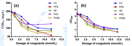 As can be seen from Figure 1, CODCr and UV254 values obviously decreased with increasing coagulant dosage in the beginning, and the trend slowed down later on. An increasing tendency even emerged as coagulant dosage increased to higher than 8 mmol/L. At a small dosage of coagulants, the removal efficiency of organic compounds was relatively low due to the difficulty of flocs formation or sedimentation of small flocs. With the dosage increasing, flocs grow bigger and the precipitation also gets faster, which speeds up the removal efficiency. At a low dosage of coagulants, the main coagulation mechanisms are charge neutralization and adsorption bridging, while at high dosage adsorption bridging as well as net capturing and precipitation play a vital role in organics removal [21,36].
