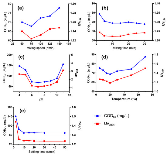 As shown in Figure 2, operation conditions posed a significant impact on the removal of organic compounds, including mixing speed, mixing time, pH, temperature and settling time. As the mixing speed increased, the removal efficiency reached a high of 75 r/min and decreased at higher speeds (Figure 2a). Low flocculation speed would result in insufficient contact between flocs and organic compounds, while too high a speed would cause vigorous stirring and shear force that would not only hinder the formation of large flocs but also break newly formed flocs. Generally, the CODCr concentration decreases when extending flocculation time, as time is needed for floc formation and agglomeration. However, as time progressed longer than 10 min, the removal efficiency of CODCr and UV254 no longer exhibited a downward trend (Figure 2b).