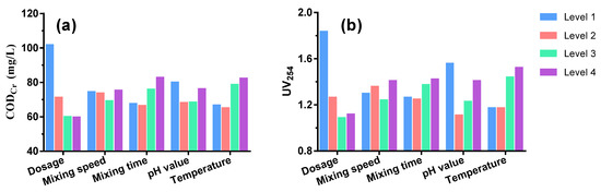 Taguchi L16 experiment results of CODCr (a) and UV254 (b) removal performance by PASS at four levels of varied factors.
