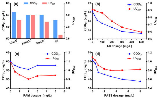 The potential enhancement of the coagulation performance with the help of other physico-chemical methods was investigated, which is of significance especially for wastewater that is notoriously difficult to purify by a single coagulation process. As shown in Figure 4a, compared to the blank, pre-oxidation by KMnO4 and NaClO did not realize any improvement of CODCr removal; KMnO4 even contributes to some UV254 increase due to its own colority. Only pre-oxidation by ozone had obvious benefit to the removal of organic compounds, especially in achieving a high UV254 removal due to its efficient decoloration performance.
