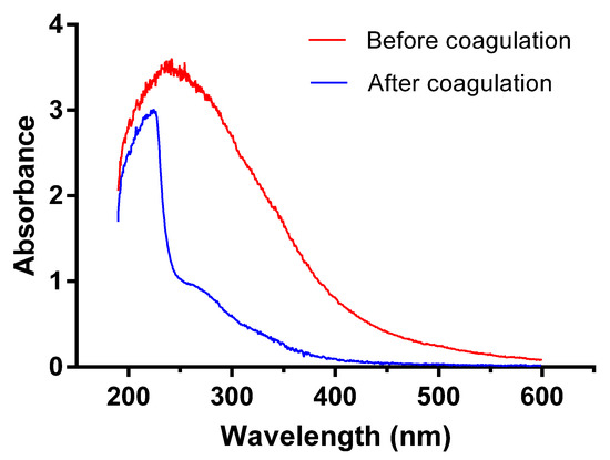 The raw coking wastewater used for the coagulation tests was collected from the effluent of a lab-scale biological anaerobic and aerobic filter treating coking wastewater, which was originally taken from a coking plant in Tangshan, Hebei province. The average CODCr and UV254 value of the effluent was 196.67 mg/L and 3.358 cm−1, respectively. The temperature and pH averaged at 20 °C and 8.32, respectively. Notably, only the removal of organic compounds was emphasized, as the ammonium had been degraded to as low as 5.12 mg/L by the biological process [30,31].