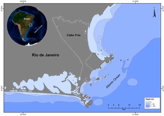 One of the main oceanographic characteristics of the Região dos Lagos is an upwelling phenomenon, which occurs mainly during the summer due to the winds that blow in the E-NE direction, along the continental margin towards the open sea [25,26]. Thus, the Região dos Lagos is a highly productive area and the feeding grounds and migration route for many species, including marine mammals.