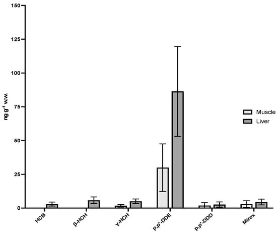 Among all analyzed pesticide, only p,p′-DDE, p,p′-DDD, HCB, β- and γ-HCHs and Mirex were detected above the MQL in Franciscana dolphins. DDT metabolites (p,p′-DDE and p,p′-DDD) were the predominant compounds, with the highest concentrations detected in liver (means of 2.64 and 86.4 ng·g−1 ww). Overall, hepatic concentrations were higher than in muscle for all detected compounds (means of 1.88 and 30.0 ng·g−1 ww). Organochlorine pesticide concentrations in Franciscana dolphin liver and muscle are depicted in Table S4 and Figure 2.