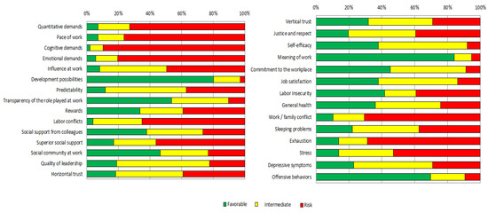 According to the respondents, the main risk factors, showed in red label in Figure 1 (from right to left), are those presenting the higher percentages of respondents, which were: 89.7% for cognitive demands; 80.6% for emotional demands; 76.5% for pace of work; 72.9% for quantitative demands; 70.6% for work/family conflicts; and 65% for labor conflicts. Among the health and well-being scales, exhaustion (or burnout), showed the higher percentage of unfavorable results (68.8%), which means a big risk.