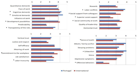 The horizontal axis of Figure 2 represents the means of all responses obtained for each case. An asterisk* has been added to the most significant results. Thus, by analyzing Figure 2, it is possible to confirm that significant statistical differences exist between these groups on some study scales while others are not significant. Therefore, for these results and looking only to those that exist, on statistical difference, we can state that for teachers in Portugal, when we compare with teachers from other countries, the main risks are, among others, emotional demands, cognitive demands, work/family conflict, labor conflicts, and exhaustion, that is, burnout. In comparison, the risks that involve more teachers in the international system are, among others: development possibilities, meaning of work, pace of work, social community at work.