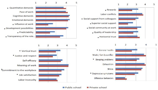 It is necessary to be aware that when we speak about public schools, these are schools that have public funding from the local authorities. It’s called public because the taxpayer pays for it. When referencing private schools, which are paid for by the students’ parents or careers, the school provides the British curriculum if it is called private international. The factors: pace of work, quantitative demands, labor conflicts, horizontal trust, work/labor conflicts and exhaustion (or burnout), are more prevalent for teachers in private schools. The horizontal axis of Figure 3 represents the means of all responses obtained for each case. An asterisk * has been added to the most significant results. Thus, as it is shown in Figure 3, the differences observed are not statistically significant. In the sample, according to Figure 3, the factors cognitive demands, emotional demands, development possibilities, social community at work, quality of leadership, general health, sleeping problems, stress, and depressive symptoms are more prevalent for public school teachers.