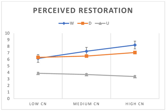 The participants’ mean score of perceived restoration (PR), preference (PREF) and familiarity (FAM) for the three types of Nature: wild, domesticated and urban (W, D, U) was calculated across the three levels of CN (Table 4).