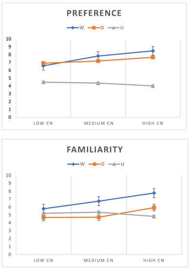 To verify the effect of CN on PR, PREF and FAM of the three types of Nature (W, D, U), a Repeated Measure ANOVA was run on these means (CN: fixed factor). The following significant effects turned out: the significant interactions between types of Nature * levels of CN on PR: F(4, 622) = 11.57, p = 0.000; on PREF: F(4, 622) = 7.52, p = 0.000; and on FAM: F(4, 622) = 6.84. p = 0.000; the significant effect within subjects of PR: F(2, 622) = 300.10, p = 0.000; of PREF: F(2, 622) = 208.77. p = 0.000; of FAM: F(2, 622) = 34.16. p = 0.000; the significant effect between subjects of CN on PR: F(2, 311) = 7.63, p = 0.001; on PREF: F(2, 311) = 4.91, p = 0.008; on FAM: F(2, 311) = 5.81. p = 0.003; (all p < 0.01). Participants’ level of connection to Nature significantly affected the assessments of each image. However, participants’ perceived restoration, preference and familiarity of each image also varied significantly based on the type of Nature. The graphs (Figure 2) show the interaction between types of Nature * levels of CN on the dependent variables. Perceived restoration and preference show the same trend for the three levels of connection to Nature across the three types of Nature.