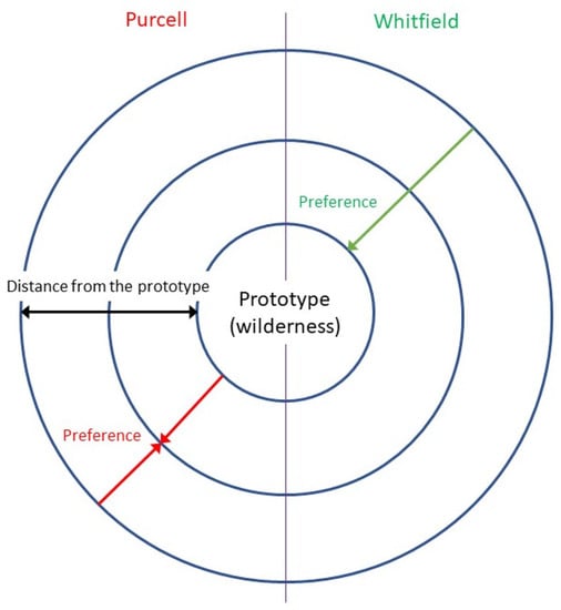 Solastalgia can be described by two models of preference: the model proposed by Whitfield [55] and the discrepancy model by Purcell [56]. Both models are concentric in that they focus on the prototype, which the authors place at the centre of the preference evaluation process, and the set consists of all environmental instances. The models differ in the location of the individual’s maximum preference, which coincides with the prototype in Whitfield’s model, whereas in Purcell’s model it corresponds to a position halfway between the prototype and the external margin of the set (Figure 3). If, in the light of our results, we place wilderness as the prototype in Figure 3 and consider preference for the three types of Nature along with the individuals’ level of connection to Nature, we can hypothesise that Whitfield’s model would work better for individuals with a high connection to Nature, while Purcell’s model would be more accurate for those with a low connection to Nature. Accordingly, perceived restoration depends not only on the individual’s connection to Nature, but also on how far the preferred natural environment is from the wilderness prototype. These models allow us to introduce a cognitive explanation of solastalgia. Individuals with a high connection to Nature are expected to experience solastalgia when they are in an urban environment that is far from the prototype of wilderness (Whitfield’s model), whereas individuals with a low connection to Nature should suffer from solastalgia when they move away from the prototype of wilderness. This could explain their (alleged) familiarity with wilderness, whilst preferring and perceiving domesticated Nature (which is positioned in an intermediate position between wilderness and urban environment) as more restorative than urban Nature (Purcell’s model). Therefore, we can hypothesise for individuals to overcome biophobia, which mainly occurs in individuals with a low connection to Nature [57], the best strategy would be for them to make initial contact with domesticated Nature in protected environments (perceived as more restorative than wilderness) before they approach wilderness [58] (pp. 185–207), the more familiar ancestral prototype.