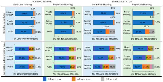Home smoking rules and support for indoor multi-unit housing smoking bans among multi-unit housing and single-unit housing residents based on housing tenure and smoking status, 2019. Notes: 1. Percentages are weighted. 2. p-values for all chi-squared tests were statistically significant at p < 0.0001 (see Supplementary Tables S3 and S4 for details). 3. Number of respondents (unweighted) based on housing tenure—multi-unit housing: public, n = 873; privately owned, n = 2520; privately rented, n = 5865; single-unit housing: public, n = 185; privately owned, n = 24,720; privately rented, n = 4567. 4. Number of respondents (unweighted) by smoking status—multi-unit housing: Never smoked, n = 6421; Formerly smoked, n = 1756; Currently smoking, n = 1069; single-unit housing: Never smoked, n = 19,746; Formerly smoked; n = 6421. Currently smoking, n = 3252. 5. Multi-unit housing is defined as two or more housing units that share a wall or ceiling. Single-unit housing refers to independent housing units such as single-family homes, mobile homes, and other housing units that do not share a wall or ceiling. 6. Home smoking rules determined by analyzing responses to the following TUS-CPS question: Which statement best describes the rules about smoking inside your home? (FR: Read if necessary; “Home” is where you live. “Rules” include any unwritten “Rules” and pertain to all people whether or not they reside in the home or are visitors, workmen, etc. “Smoking” includes cigars, regular and hookah pipes, as well as cigarettes). (1) No one is allowed to smoke anywhere inside your home. (2) Smoking is allowed in some places or at some times inside your home. (3) Smoking is permitted anywhere inside your home. 7. Support for indoor smoking bans determined by analyzing responses to the following TUS-CPS question: In buildings with multiple apartments or living areas, do you THINK that smoking should be (1) Allowed inside all apartments or living areas, (2) Allowed inside some apartments, (3) Not allowed at all inside apartments? * Rent includes no cash rent or rent without payment.