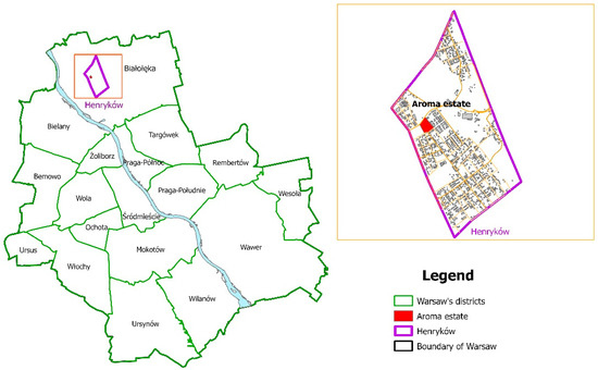 We chose the industrial complex in Henryków, originally a small town in the northeast, not far from the then borders of Warsaw, as an example use case. Now, it is a part of the Białołęka district of Warsaw (Figure 1). A plant-producing baker’s yeast was established in 1902 by the entrepreneur Henryk Bienenthal, after whom the place took its later name of Henryków. Until the outbreak of the Second World War, the plant operated very dynamically, while after the war, there was a break of about 10 years, and it was not until 1955 that the production of fragrance synthetics was launched there. The Pollena-Aroma Fragrance Factory operated on the site until 2012, when it moved to its headquarters in Nowy Dwór Mazowiecki, a town 25 km to the southeast of Henryków [39].