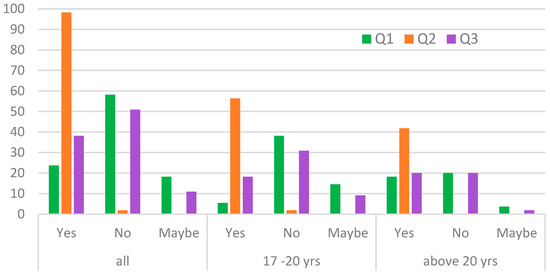 The next question was about awareness of potential pollution in such areas (Q2). Most of the respondents are aware that there may be contamination of the land on and in the immediate vicinity of post-industrial areas, e.g., heavy metals, organic compounds (Figure 2 ). Moreover, the majority of respondents, independent of their age, do not associate the fact of living in such areas with potential impacts (i.e., risks, consequences) on the residents’ health (Q3, Figure 2). Such responses are a kind of explanation for such a large number of negative answers to the first question (Q1), despite the fact that the survey was preceded by an introduction lasting several minutes, during which potential survey respondents were acquainted with the phenomenon of transforming post-industrial areas into residential areas and briefly presented the obligations of the owner of the transformed plots in the context of adjusting the area to the goal of the health of future residents of these areas.