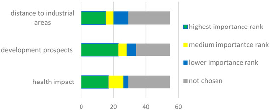 Respondents were also asked to indicate eight factors out of a predetermined list of options that would be decisive in selecting an apartment, and rank their importance. The health impact of existing or historical pollutants in the area (e.g., air, water, ground) or noise emitted into the environment was chosen by 53% of respondents as one of the eight decisive factors (Figure 5). For 47% of survey participants, the health impact was ranked as the highest or medium importance (among these eight indicated factors).