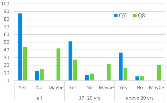 The last group of questions concerned the aspect of environmental awareness for temporary and future generations. We wondered whether a future/current resident of a post-industrial area might be interested in whether the Developer has taken care of the environment (Q7) and whether the ecological footprint, in general, is of great importance to the respondent in question (Q8). It turned out that the majority of residents, independently of their age group, would like to do their part to protect the Earth’s environment (Figure 6) by choosing a Developer who cares about the environment, but only half are interested (or aware) of minimising the ecological footprint.