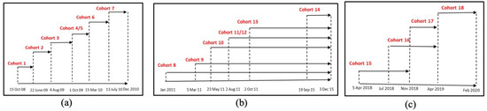 Figure 2. Distribution and timeline for cohorts 1–18: (a) cohorts 1–7, (b) cohorts 8–14, and (c) cohorts 15–18.