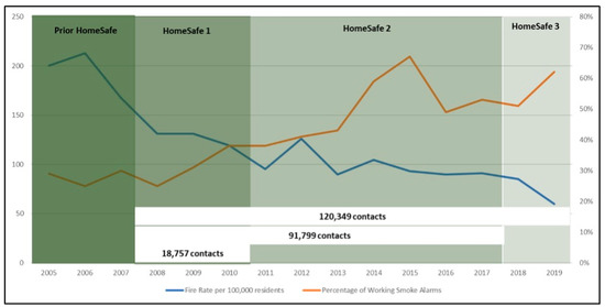 The implemented HomeSafe initiatives yielded a substantial increase in functioning smoke alarms and a significant decrease in residential fire occurrences and fatalities. This was achieved through cohort visits conducted by firefighters, inspection and installation of smoke alarms conducted upon request, and validation of smoke alarms by fire crews during incidents. Nonetheless, a reverse pattern was reported in relation to the interventions related to distributing information packages and door-to-door hangers, which failed to show any effectiveness in reducing fire rates.